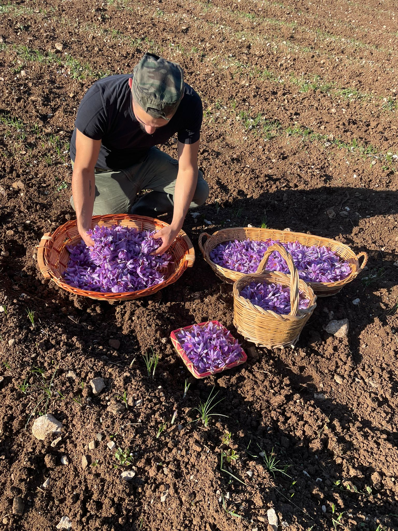 Lo Zafferano è una spezia che si ottiene dagli stigmi del fiore del Crocus Sativus, una pianta della famiglia delle Iridacee. La raccolta dura circa 20 giorni per un periodo che oscilla tra ottobre e novembre. I fiori vengono raccolti all'alba, prima che il sole li possa aprire e vengono quindi portati a casa dove avviene il paziente lavoro della sfioritura. Ciascun fiore viene aperto con le mani e da esso si estraggono solo i tre pistilli rossi contenuti all'interno, lo zafferano appunto. Una volta terminata la sfioritura i pistilli vengono essiccati attraverso l’uso di una fonte di calore.